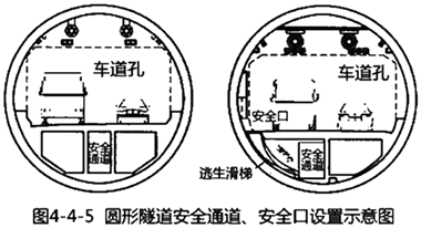 圓形隧道的安全通道常設(shè)置在車道板下,通過安全口和爬梯、滑梯進出。人員可從安全口,經(jīng)安全通道進行長距離疏散。