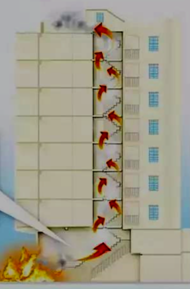 若火風(fēng)壓等于或小于進(jìn)風(fēng)口的壓力,則煙火便全部從內(nèi)部蔓延,當(dāng)它進(jìn)入樓梯間、電梯井、管道井、電纜井等豎向孔道以后,會大大加強(qiáng)煙囪效應(yīng)。