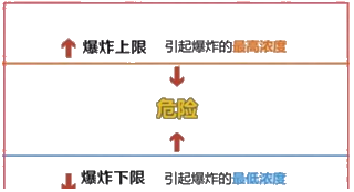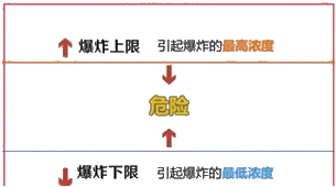 能引起爆炸的最高濃度稱為爆炸上限,能引起爆炸的最低濃度稱為爆炸下限,上限和下限之間的間隔稱為爆炸范圍。
