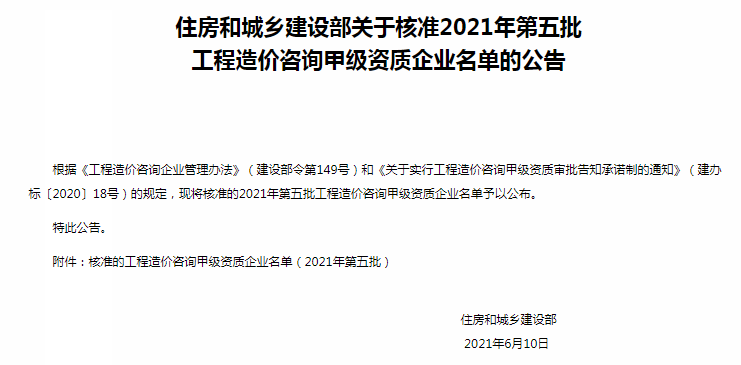 2021年第五批工程造價咨詢甲級資質(zhì)企業(yè)名單的公告