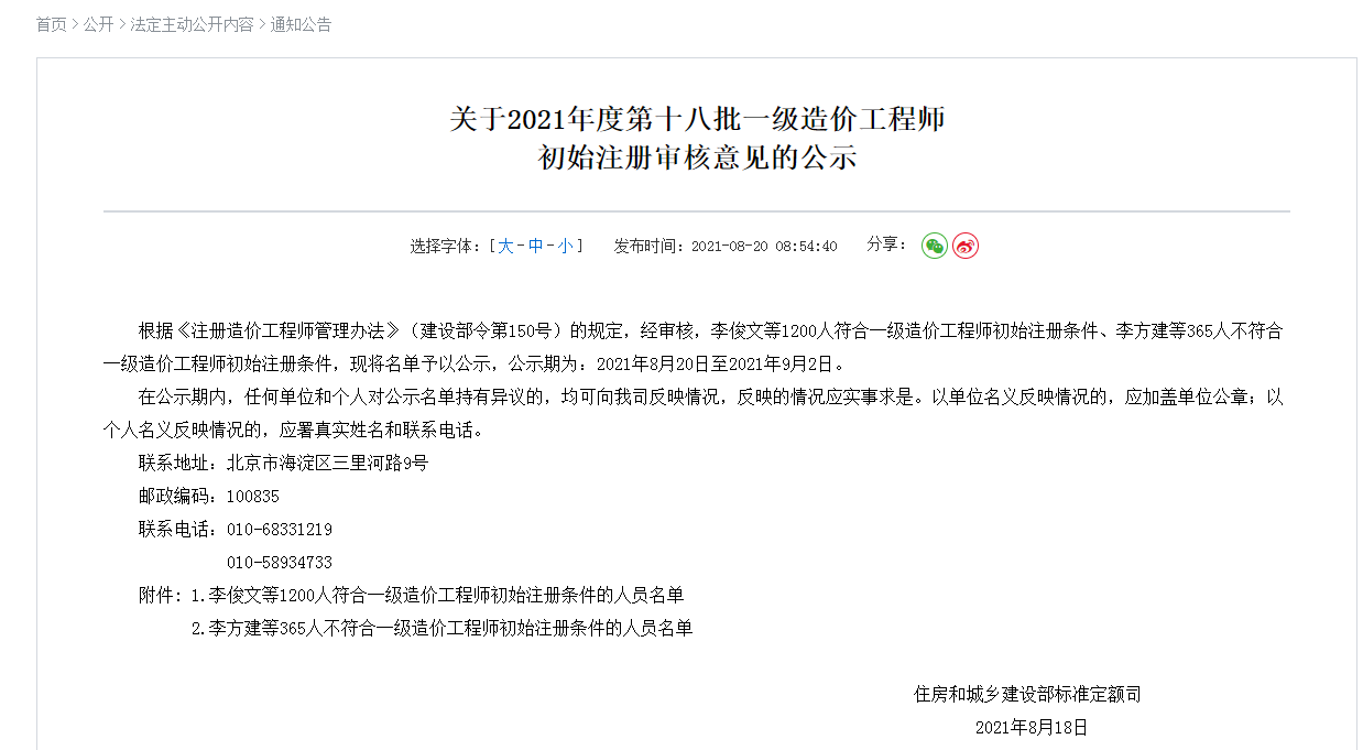 根據(jù)《注冊造價工程師管理辦法》(建設(shè)部令第150號)的規(guī)定,經(jīng)審核,李俊文等1200人符合一級造價工程師初始注冊條件、李方建等365人不符合一級造價工程師初始注冊條件,現(xiàn)將名單予以公示,公示期為:2021年8月20日至2021年9月2日。