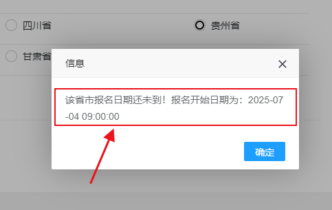 登錄中國人事考試網(wǎng)進(jìn)入網(wǎng)上報名,選擇“貴州省”后,提示“報名開始時間為2025-07-04 09:00”。目前貴州省人事考試信息網(wǎng)暫未發(fā)布官方通知,各位考生后期可隨時關(guān)注。