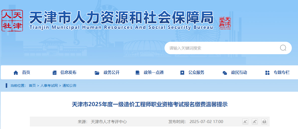 天津市2025年度一級造價工程師職業(yè)資格考試報名繳費溫馨提示