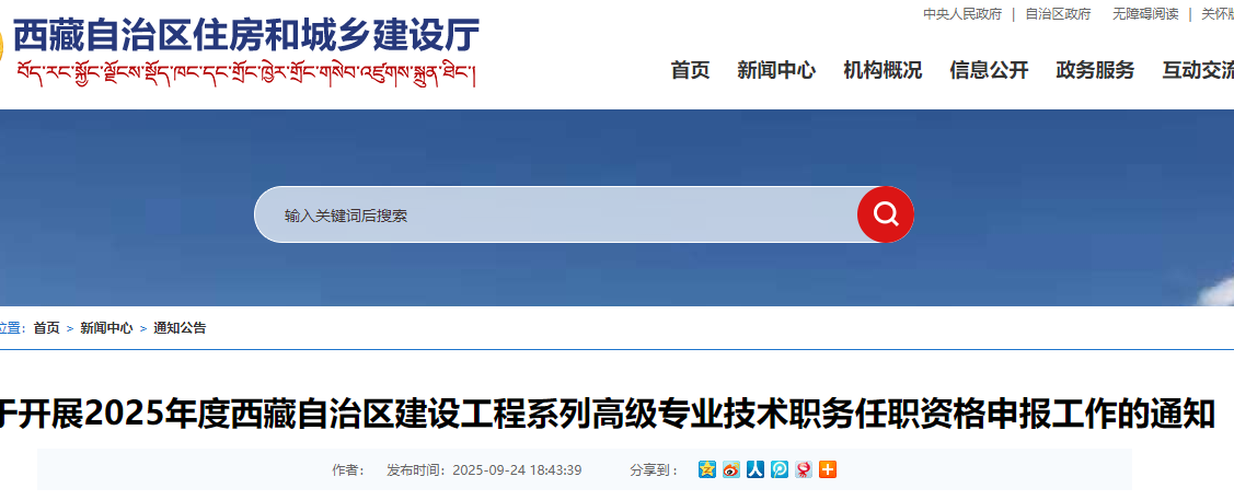 2025年度西藏自治區(qū)建設(shè)工程系列高級專業(yè)技術(shù)職務(wù)任職資格申報工作的通知已發(fā)布,申報截止時間2025年10月24日,逾期不予受理。詳細(xì)通知如下: