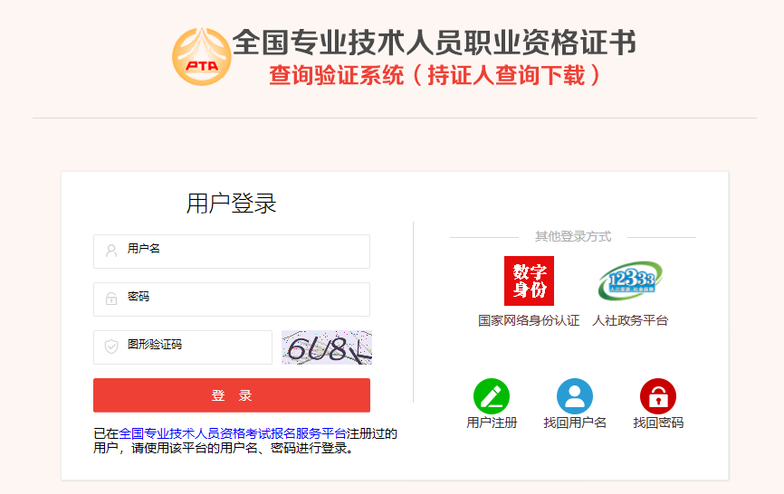 已在中國(guó)人事考試網(wǎng)“全國(guó)專業(yè)技術(shù)人員資格考試報(bào)名服務(wù)平臺(tái)”注冊(cè)過的持證人員,請(qǐng)直接使用該平臺(tái)的用戶名、密碼進(jìn)行登錄。