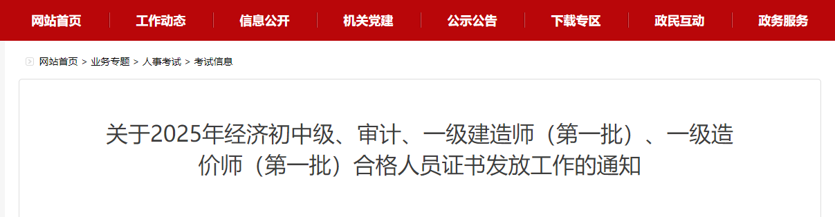 關(guān)于2025年經(jīng)濟(jì)初中級(jí)、審計(jì)、一級(jí)建造師(第一批)、一級(jí)造價(jià)師(第一批)合格人員證書發(fā)放工作的通知