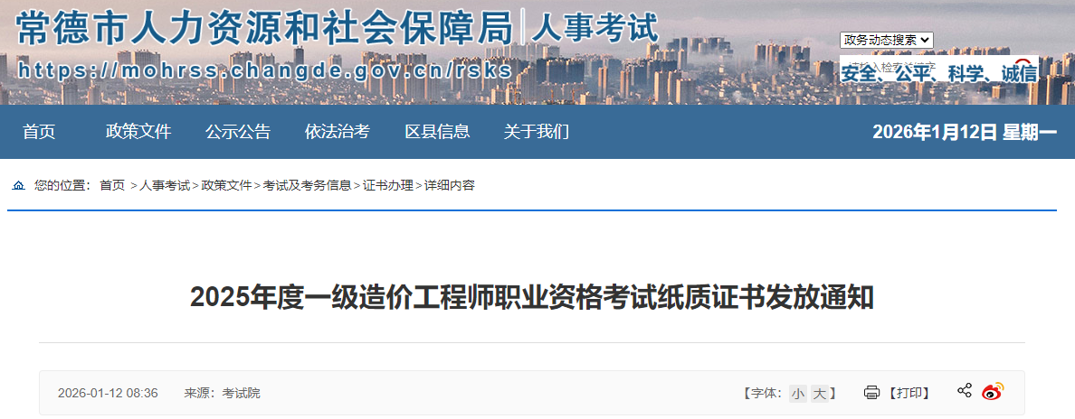 湖南省常德市2025年度一級造價工程師職業(yè)資格考試紙質證書發(fā)放通知