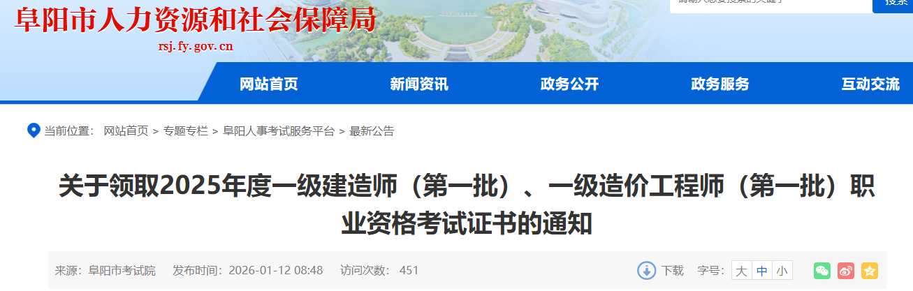 安徽省阜陽市2025年一級造價師考試證書領取通知