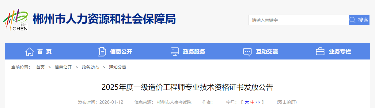 湖南郴州2025年度一級(jí)造價(jià)工程師專業(yè)技術(shù)資格證書(shū)發(fā)放公告