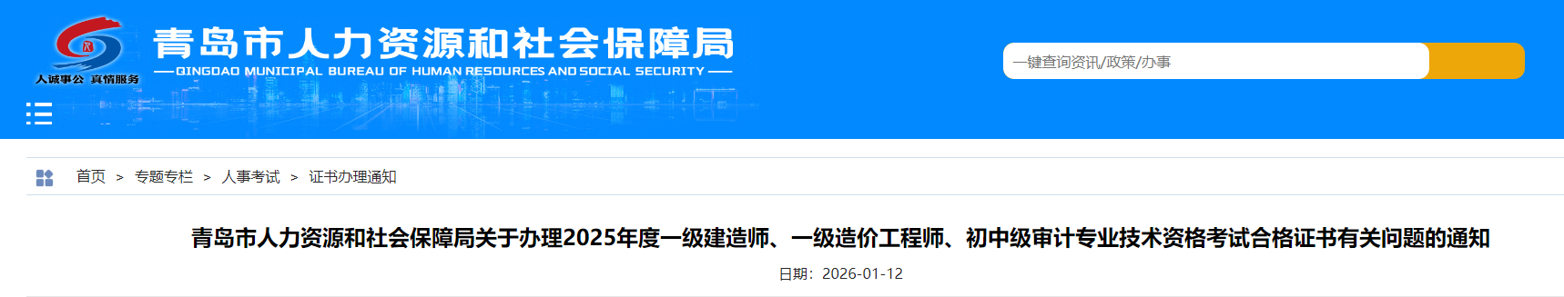 青島市人力資源和社會保障局關于辦理2025年度一級建造師、一級造價工程師、初中級審計專業(yè)技術資格考試合格證書有關問題的通知