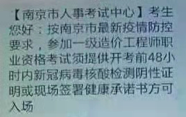 2021南京一級造價(jià)師考試即將來臨,面對再次席卷而來的疫情,各地都紛紛采取了相應(yīng)的疫情防控措施。那么南京市一級造價(jià)師考試有關(guān)疫情防控有什么新的政策和措施嗎?根據(jù)考生提供的短信截圖,我們獲取了南京市人事考試中心最新的疫情防控要求,內(nèi)容如下: