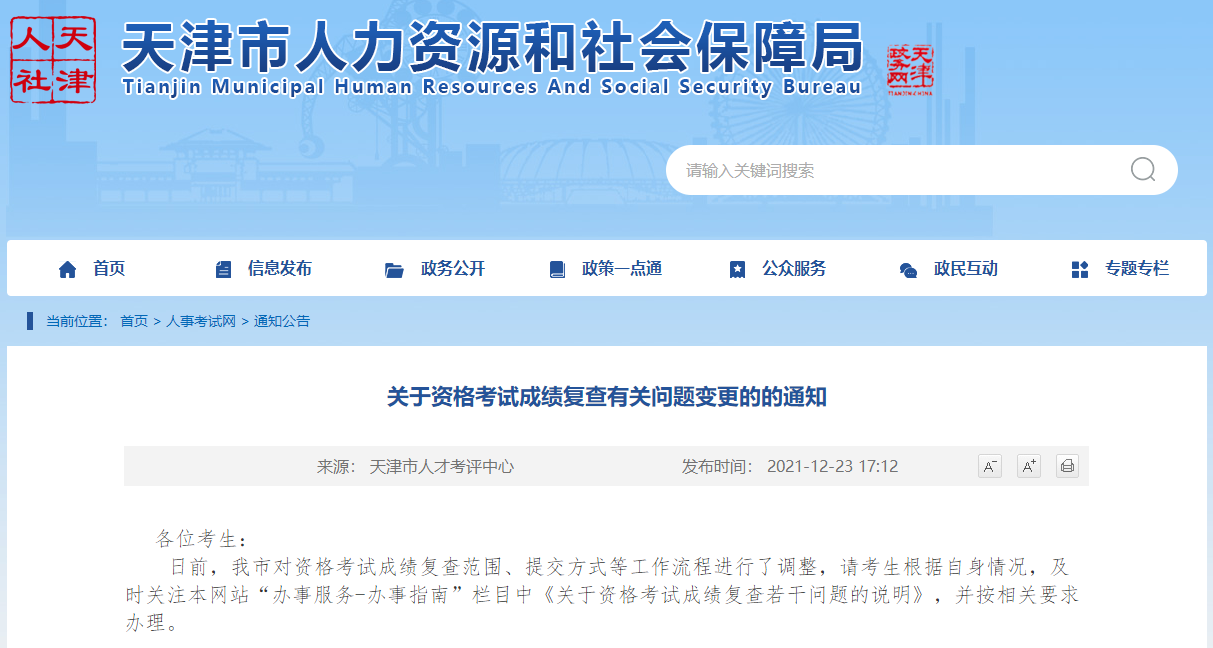 日前,我市對資格考試成績復查范圍、提交方式等工作流程進行了調整,請考生根據(jù)自身情況,及時關注本網(wǎng)站“辦事服務-辦事指南”欄目中《關于資格考試成績復查若干問題的說明》,并按相關要求辦理。