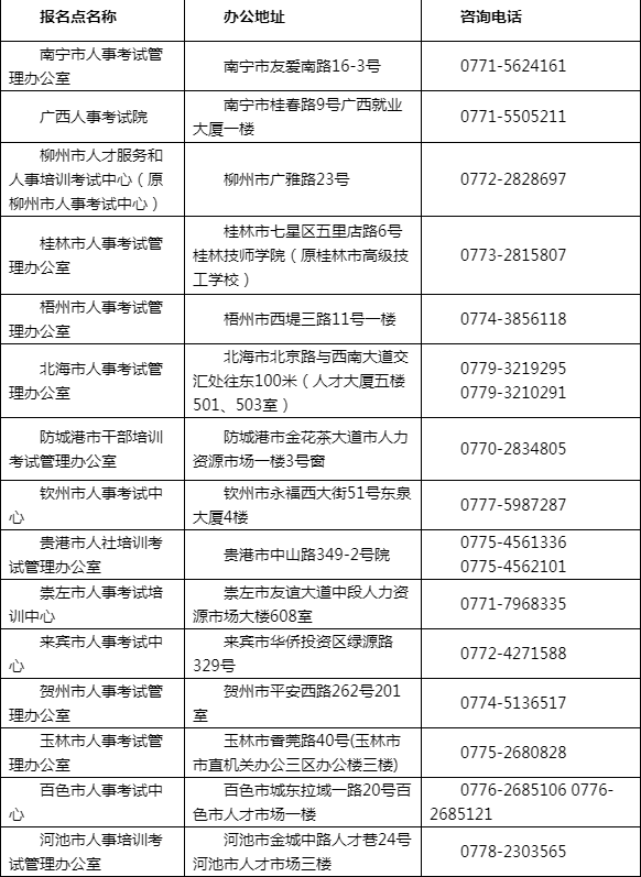 現(xiàn)場(chǎng)審核對(duì)象是不適用告知承諾制的報(bào)考人員,即被記入專業(yè)技術(shù)人員資格考試誠(chéng)信檔案庫(kù)且在記錄期內(nèi)的應(yīng)試人員。在網(wǎng)上報(bào)名系統(tǒng)填寫報(bào)考信息時(shí),將收到本次報(bào)名審核不適用告知承諾制的提示,請(qǐng)持本人居民身份證、學(xué)歷、學(xué)位證書原件和相關(guān)專業(yè)技術(shù)職務(wù)任職資格證書原件(原件經(jīng)審核后退還),《資格考試報(bào)名表》1份,于2019年8月19日至20日到各市人事考試機(jī)構(gòu)進(jìn)行現(xiàn)場(chǎng)審核,全區(qū)人事考試機(jī)構(gòu)現(xiàn)場(chǎng)審核地址及聯(lián)系方式如下: