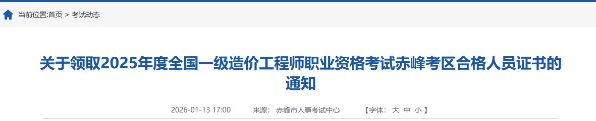 內(nèi)蒙古赤峰市2025年度一級造價工程師資格證書領(lǐng)取通知