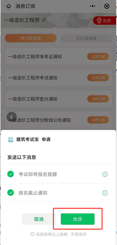 3、點擊“一級造價工程師報名通知”后,選擇“允許”按鈕,在考試報名即將開始及考試報名即將截止時,會微信通知的哦,以免錯過報考;