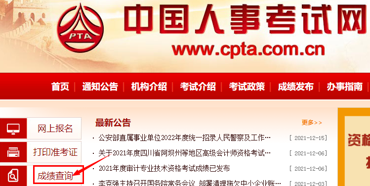 1、打開(kāi)中國(guó)人事考試網(wǎng),點(diǎn)擊左側(cè)的“成績(jī)查詢(xún)”;