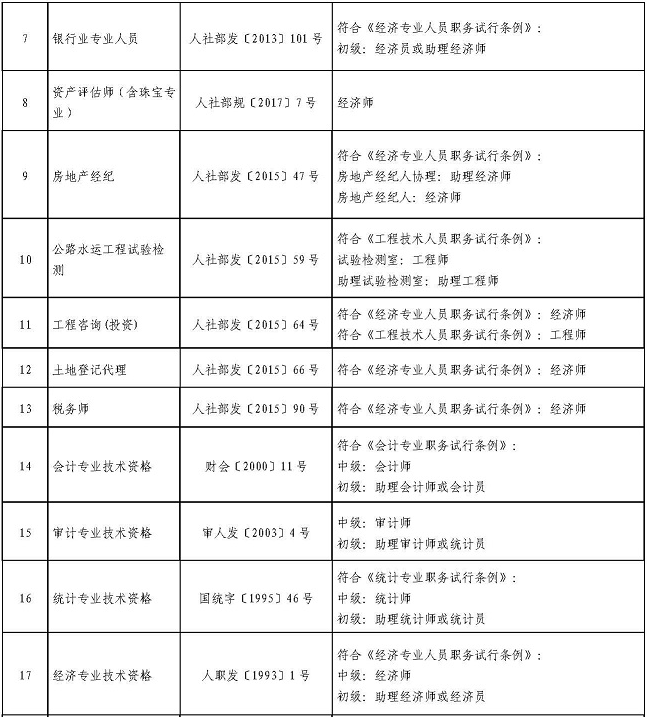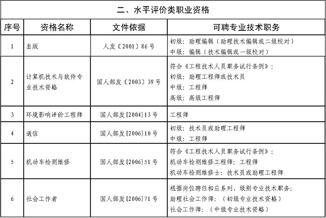 三、取得出版、計算機軟考、環(huán)境影響評價過程、通信、機動車檢測維修、社會工作者、銀行業(yè)、資產(chǎn)評估、房地產(chǎn)經(jīng)紀(jì)、公路水運工程試驗檢測、工程咨詢(投資)等19項水平評價類職業(yè)資格人員,用人單位可根據(jù)相關(guān)任職條件和崗位空缺情況聘任相應(yīng)的專業(yè)技術(shù)職務(wù)。
