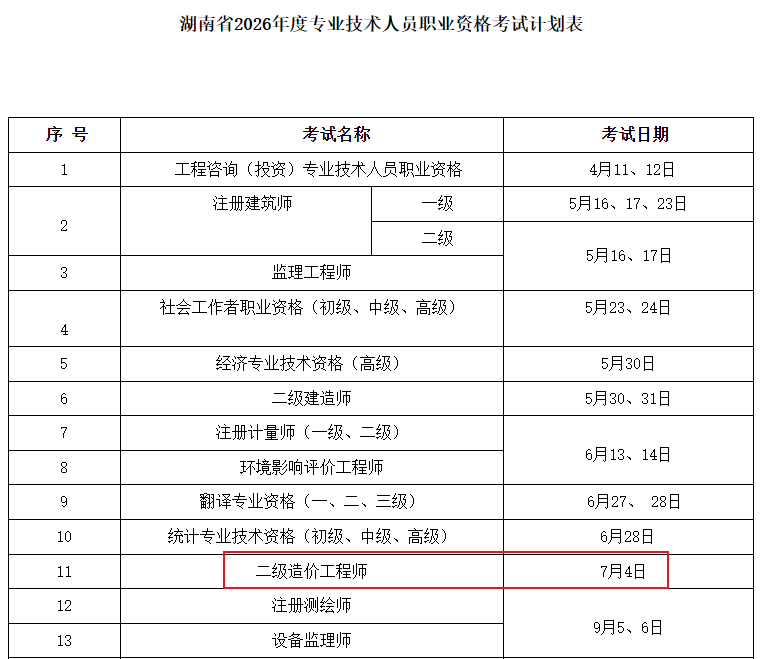 湖南省人事考試網發(fā)布2026年二級造價師考試計劃,考試時間為:7月4日,具體信息如下: