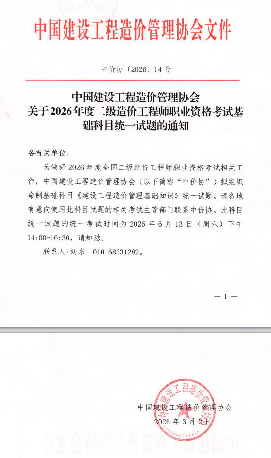 中國建設(shè)工程造價管理協(xié)會發(fā)布“關(guān)于2026年度二級造價工程師職業(yè)資格考試基礎(chǔ)科目統(tǒng)一試題的通知擬組織命制基礎(chǔ)科目《建設(shè)工程造價管理基礎(chǔ)知識》統(tǒng)一試題。此科目統(tǒng)一試題的統(tǒng)一考試時間為2026年6月13日(周六)下午14:00-16:30。請各地有意向使用此科目試題的相關(guān)考試主管部門聯(lián)系中價協(xié)。通知原文如下: