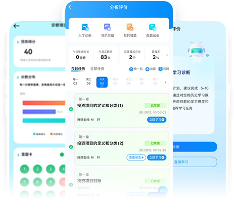 定制化學習,數(shù)據(jù)化測評,根據(jù)學習記錄生成學習數(shù)據(jù)報告,包括與過關 考生的學習情況對比、掌握/未掌握知識點圖譜、知識點掌握明細等。